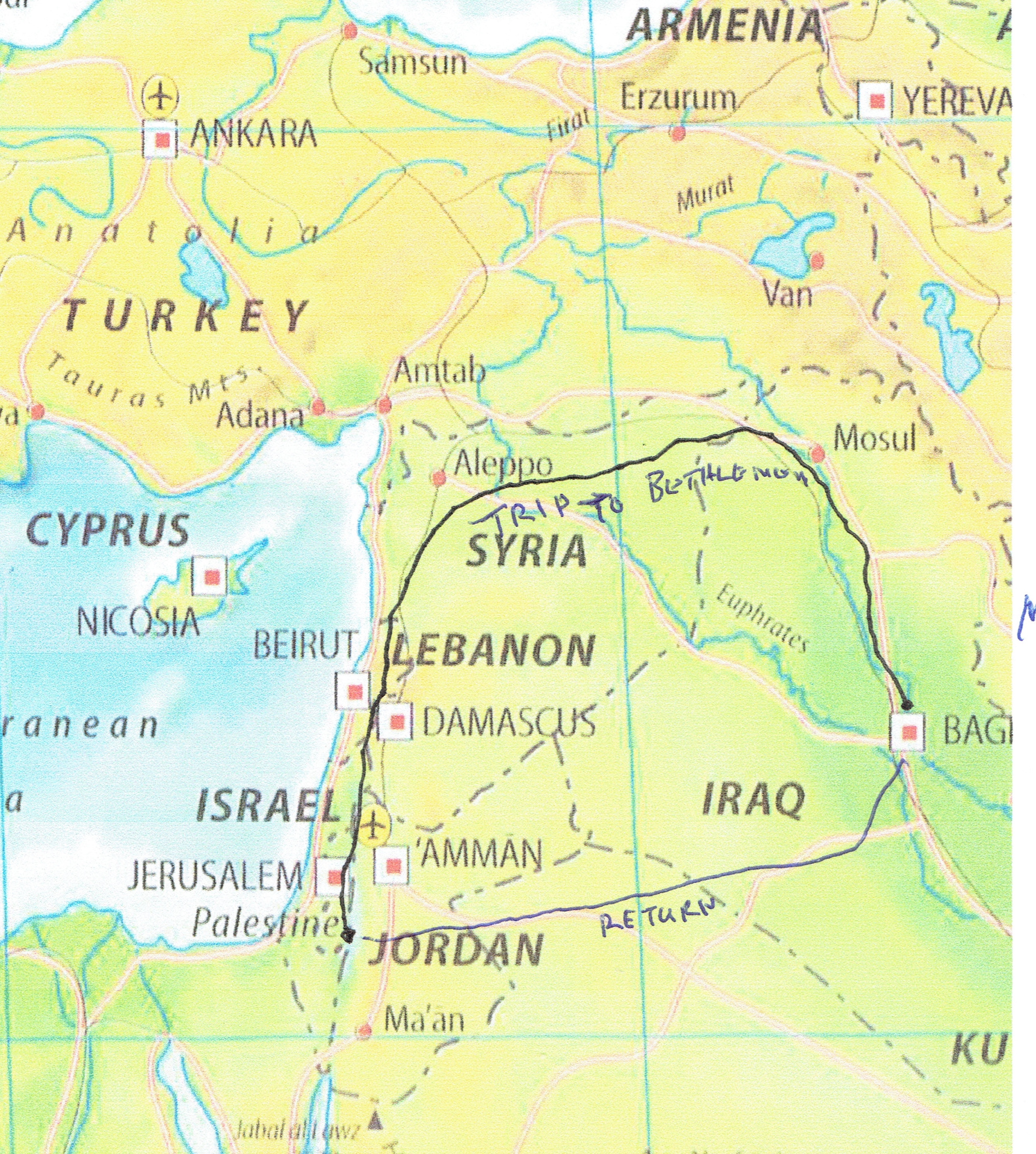 Near East, with the route of Magi to visit Jesus in Bethlehem and a quick trip back to Babylon.